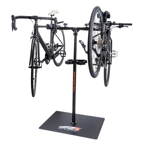Heavy-duty base or floor-mounted design for daily use in workshops. Clamps can be positioned in 5 directions. Adjustable clamp height from 100 to 140 cm. Dual clamp design makes operation easier and more efficient. Max load: 50 kg per clamp. Includes