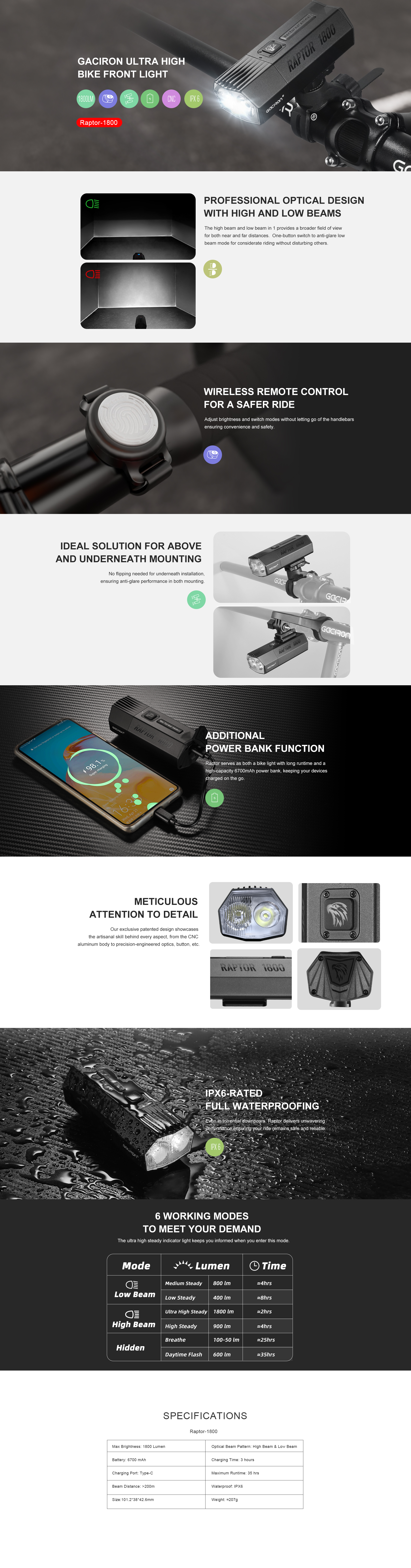| Nazwa Angielski: | HEADLIGHT GACIRON RAPTOR 1800 LUM USB 6700 MAH |