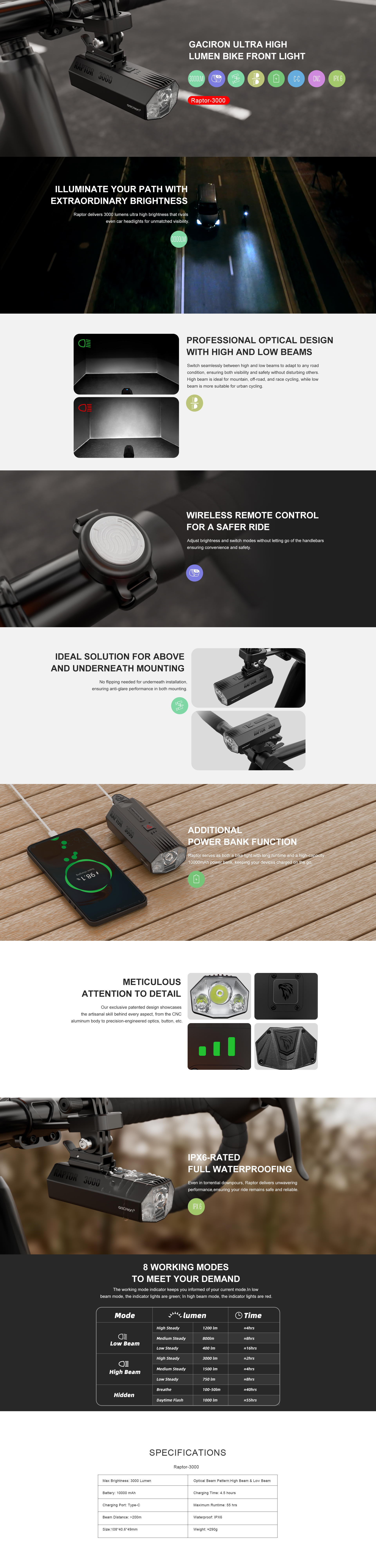 Gaciron Raptor 3000 to bardzo wydajna lampa przednia dla rowerzystów, oferująca maksymalną moc światła do 3000 lumenów i wbudowaną baterię o pojemności 10 000 mAh z możliwością ładowania przez port USB. To nie tylko mocne światło do jazdy nocą, ale także powerbank, który może zasilić urządzenia mobilne podczas wypraw. Całość zamknięta w solidnej obudowie aluminiowej CNC, odpornej na warunki atmosferyczne.