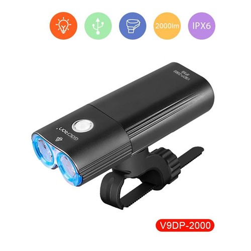 Model V9DP-2000 wyposażony jest w akumulator o dużej pojemności 6700 mAh, który obsługuje funkcję power banku, umożliwiając ładowanie urządzeń zewnętrznych, takich jak smartfony lub liczniki rowerowe. Lampka posiada sześć trybów pracy oświetlenia, umożliwiających optymalizację jasności i czasu działania w zależności od potrzeb użytkownika.