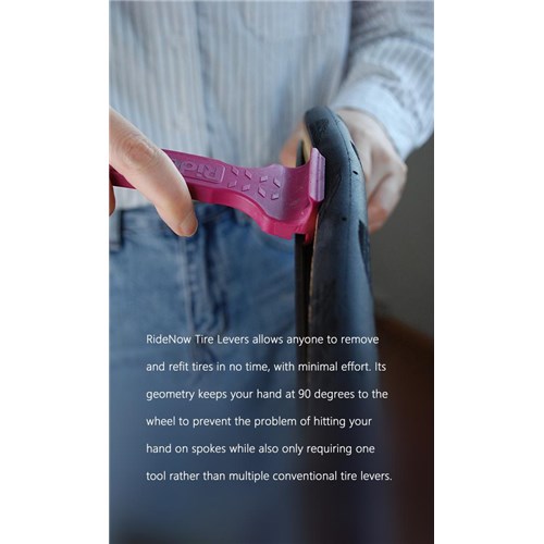 Łyżka do opon Ridenow pozwala każdemu błyskawicznie zdejmować i zakładać opony, przy minimalnym wysiłku. Ich geometria utrzymuje dłoń pod kątem 90 stopni do koła, zapobiegając uderzaniu dłonią o szprychy, a jednocześnie pozwala na użycie zaledwie jednego narzędzia zamiast wielu tradycyjnych łyżek do opon.